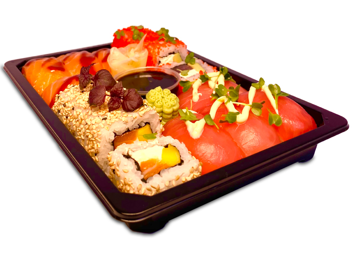 ![]() | Bento-Box - Klassik 1, D, G, K 4 California-Rolls: Lachs, Mango, Frischkäse und Sesam 4 California-Rolls: Thunfisch, Avocado, Fr.käse und Tobiko rot 4 Nigiri Lachs 4 Nigiri Thunfisch | |