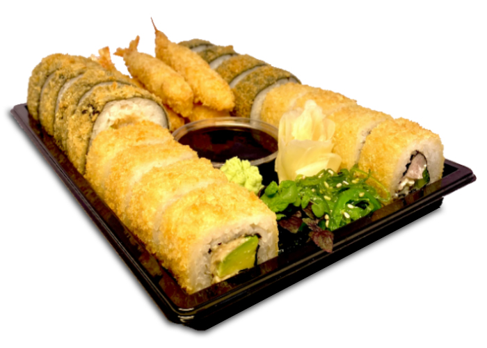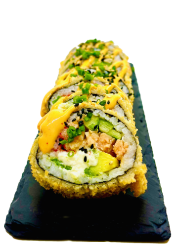 ![]() | Tempura Samurai Roll (FUTOMAKI) Knusprige Futomaki-Rolle mit frischem Lachs, Avocado, Frischkäse und Tobiko, in Tempura frittiert und veredelt mit Teriyaki-Sauce, Chili-Mayo und Schnittlauch. | |