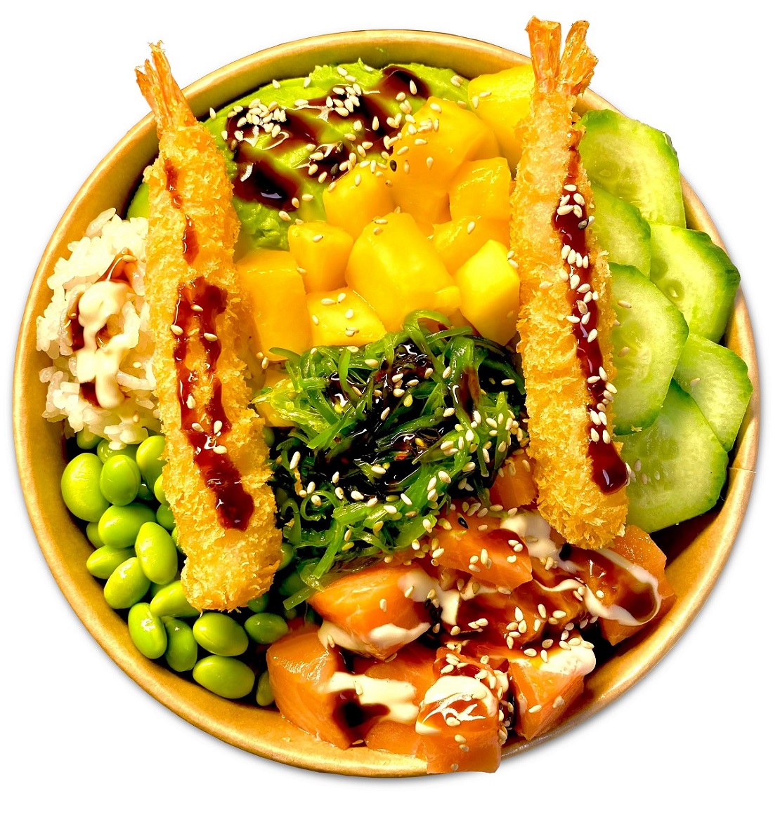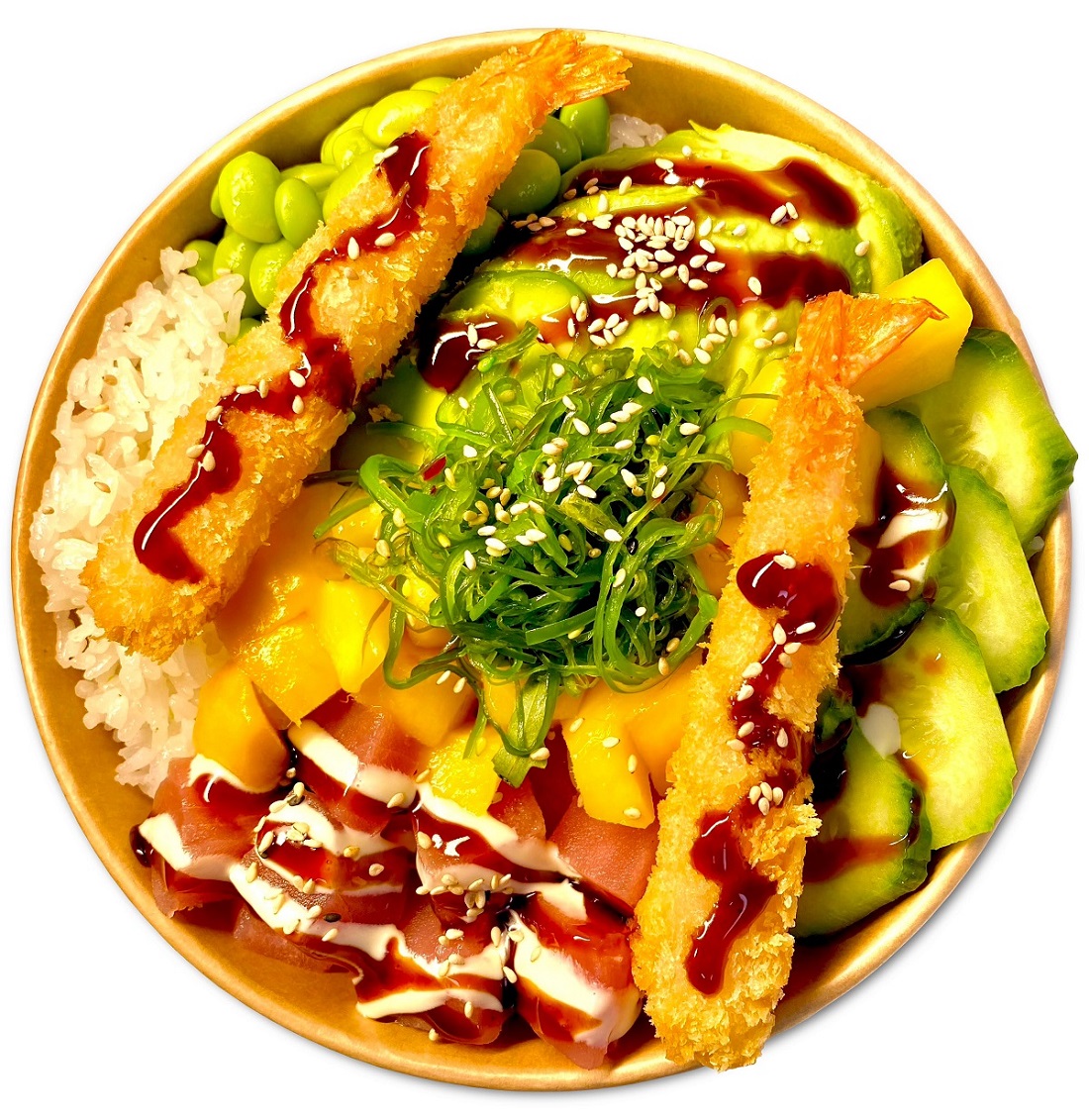 ![]() | Poké Bowl Tekka D,I,J,K miruSUSHI-Reis, Thunfisch-Sashimi Würfel, Tempuragarnelen, Mango, Edamame, Avocado, Gurke, Granatapfelkerne, Wakame, japanische Mayonnaise und Teriyakisauce | |