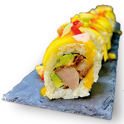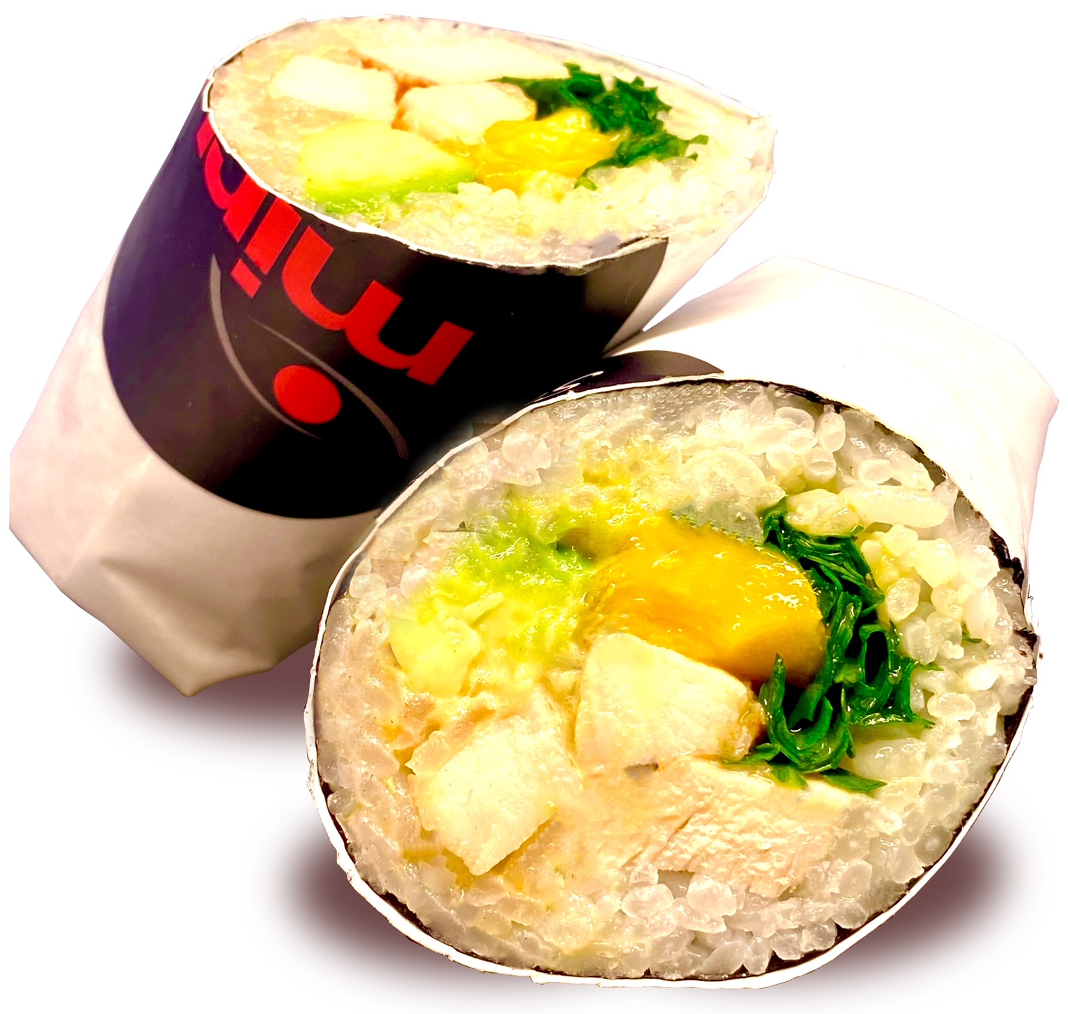 | Minarai's Dinner A, G Sushirrito mit Tempura-Chickenstreifen, leckerer Avocado, Mango, knackfrischem Rucola, Mango Chili Sauce und Teriyaki-Batasosu | ||