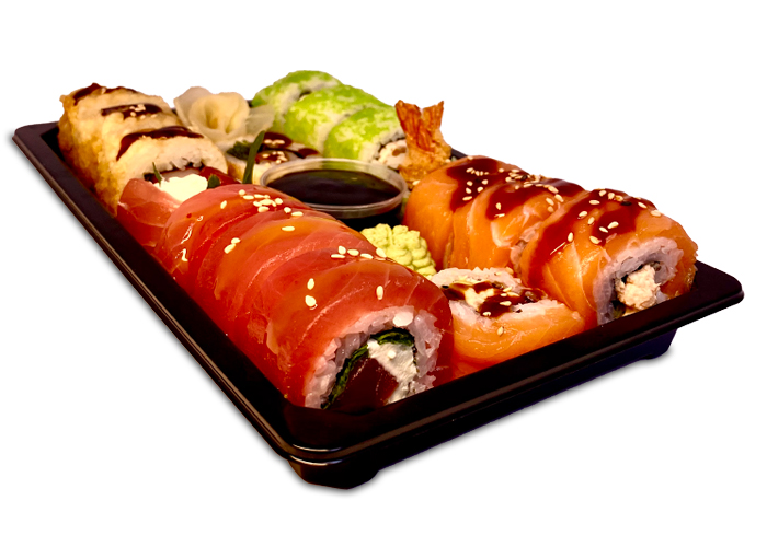 ![]() | Bento-Box - Dai-Maki 1, C, D 4 Californiarolls: Lachs, Avocado, Ponzufrischkäse, grösteter Sesammix 4 Californiarolls: Chicken, karamellisierter Pak Choi, Tempurahokkaido, Shisokresse 4 Californiarolls: Thunfisch, Schnittlauch, Avocado und Tobiko rot 4 Californiarolls: Tempuragarnele, Togarashipilly und Tobiko schwarz 4 Maki: Lachs 4 Maki: Thunfisch 4 Maki: Surimi 4 Maki: Avocado | |