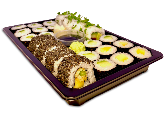 | DeLuxe VEGGIE FOR TWO 1,G,K,C,I 8 Green Shisorolls mit Tempuraspargel, Mango, veganer Jap. Mayo und Shiso Green, veganer Mayo und Furikake Nori outside. 8 Kimchi-Phillyrolls mit Avocado, Philadelphia, Roter Beete und Teriyaki und Kimchisesam outside. 8 Wakame Veggierolls mit Gurke, Roter Beete, Avocado, veganer Jap. Mayo und Wakame und gerösteter Sesam outside. 8 Tempura-Togarashi mit Togarashifrischkäse, karamellisiertem Pak Choi, Avocado, Gurke und Teriyaki und Shisokresse getoppt. 8 Maki Tamagocrunch mit Jap. Eiomelette, Jap.Mayo und crunchy Panko. 8 Maki Kappa Shiso mit Gurke, Teriyaki und Shisokresse 4 Soßenschalen extra | ||