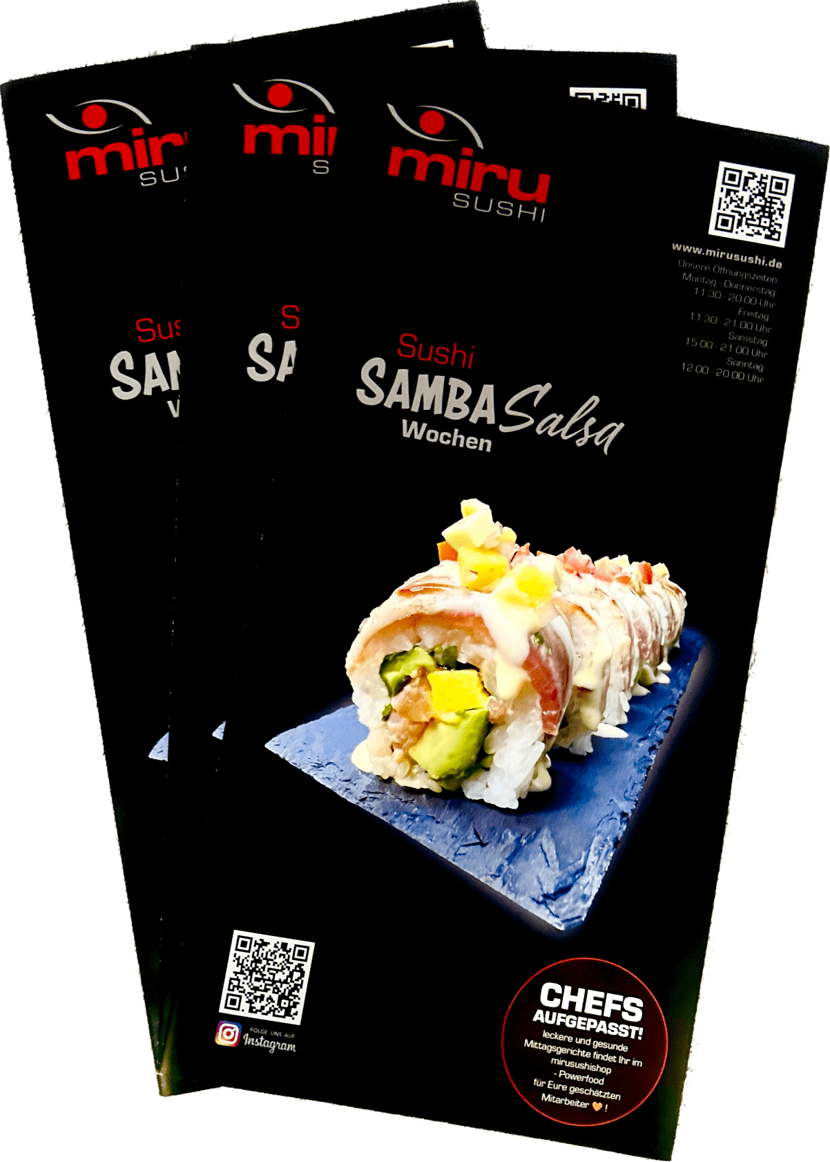![]() | SAMBADuck Mango Salsa Roll 1,2,F,J saftige Entenbrust, Avocado, karamellisierter Pak Choi, Teriyakisauce inside und frische Mango, herzhaft-fruchtiger Salsamix, gehobelte Mandeln und Mangochilisauce outside - der Geschmacksknaller! | |