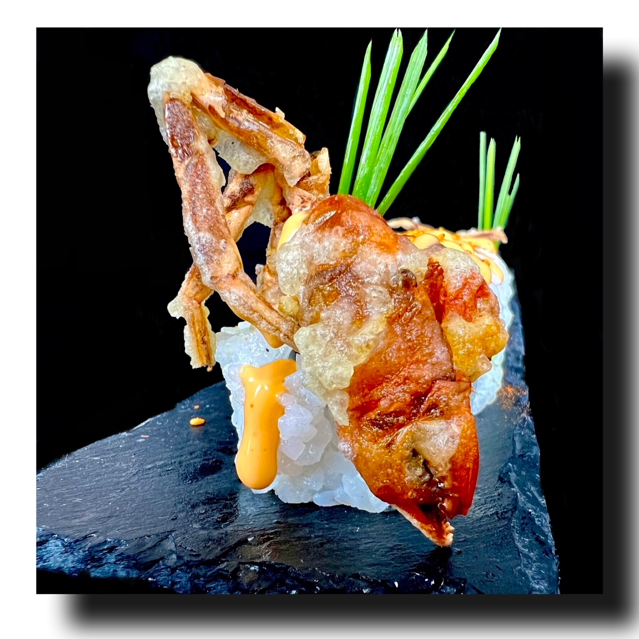 ![]() | Spiderroll Würzige Tempura-Softshellcrab, Avocado, Togarashiphilly, frischer Schnittlauch, sowie Togarashi, jap.Chilimayo und Kimchisesam outside. | |