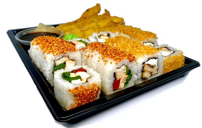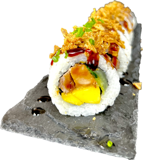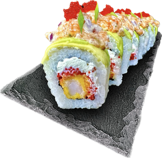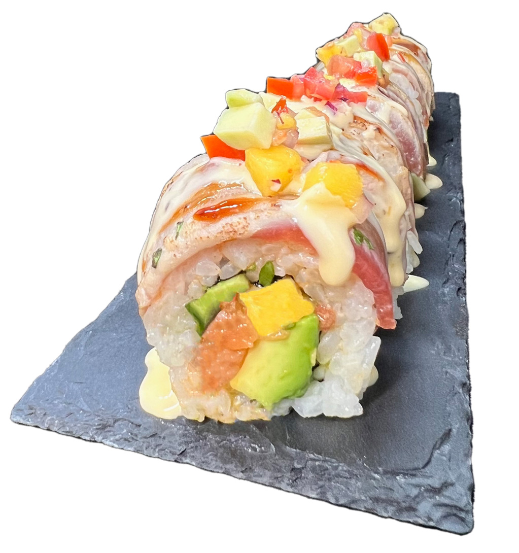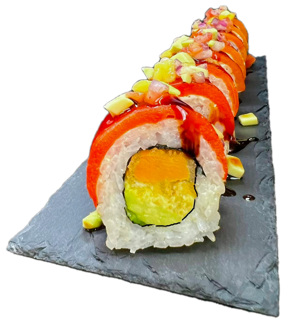 ![]() | Vegan Salsa Roll A,I Flamed Paprika, lasiert mit süßer Teriyakisauce und mit fruchtiger Salsa getoppt. Tempura-Hokkaido, Avocado, jap.vegan Mayo inside! | |