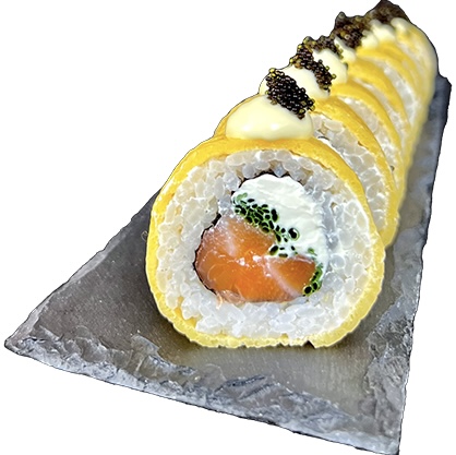 ![]() | Tamago Supreme D,C,M Sushirolle mit Jap.Tamago-Omelette, Ponzufrischkäse, frischem Lachsfilet und knackigem Schnittlauch. Getoppt mit Tobikko Black und Jap. Mayonnaise…ein Gaumen- und Augenschmaus! | |