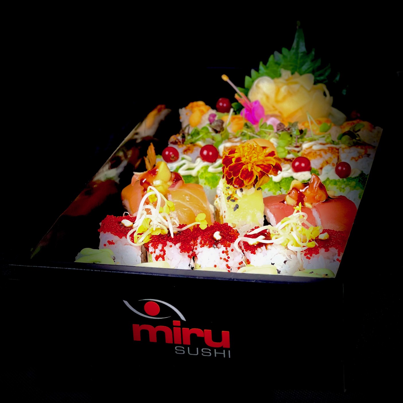 ![]() | Deluxe-Bento miruSUSHI FOR TWO 1, D, G, K,A 8 Dragonrolls: Tempuragarnele, Philly, Tobikko Red, sowie Avocado, Lachstartar, Tobikko Red und Teriyaki outside. 8 Spiderrolls: Softshellcrab, Avocado, Togarashiphilly, Schnittlauch, sowie Togarashi, Chilimayo und Kimchisesam outside. 8 Spicy Tuna Rolls: Chili-Thunfischtartar, Schnittlauch, Gurke, sowie Wasabicreme, black Sesam, Wasabisesam und Lauch outside. 8 Tempurarolls Doitsu: Teriyakilachs, karamellisierter Pak Choi, Togarashiphilly, Gurke, sowie Jap. Mayo, Teriyaki und Tobikko Black, Red & Gold als Topping 6 Tempuragarnelen 4 Yakitorispieße - mit Teriyaki und Sesammix 4 Soßenschalen extra | |
