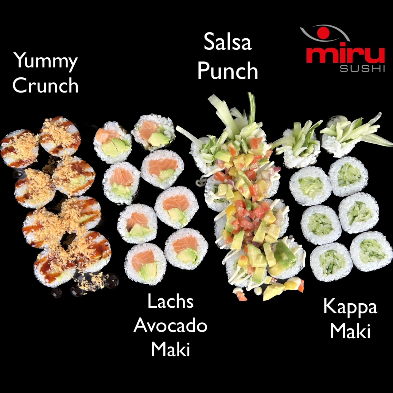 Leckerer miruSUSHI-Reis umhüllt Deine Wunschzutat. Außen klassisch die Norialge gewickelt. Wählen kannst Du jeweils, ob wir Deine Maki klassisch, als Salsapunch (vegane jap. Mayo und fruchtig-herzhafter Salsamix) oder Yummy Crunch (süße Teriyakisauce und crunchy Tempurapanko) für Dich zubereiten dürfen - Itadakimasu!