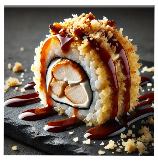 ![]() | Double Teriyaki Crunch Roll Saftiges Teriyaki-Hühnchen, kombiniert mit cremigem Frischkäse, eingerollt in Sushi-Reis. Außen knuspriges Panko und ein Schuss Teriyaki-Sauce sorgen für den perfekten Crunch und süß-herzhaften Geschmack. | |